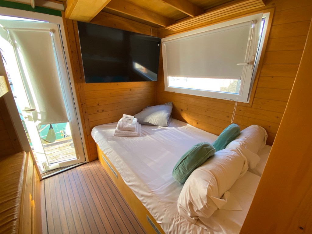 Indretning: Her er det mest basale man skal bruge, dog på småt plads, præcis som i en campingvogn. Der er en lille dobbeltseng samt en køjeseng. Det er ikke de bedste madrasser, men for et par overnatninger går det fint. Lille køkken, en sofa og et lille bitte toilet, hvor man næsten bader i håndvasken, men det fungerer. Wifi fungerede også upåklageligt og der er et fint antal kontakter, så man kan få opladet telefoner mv. Desuden min favorit – tagterrassen som var udstyret med to liggestole samt to bløde stole og en lille sofa med et tilhørende bord. Opgangen til tagterrassen er en stige når man bor i Classic husene som vi gjorde, så transport at mad og drikke er nemmest lige at hjælpes om, men det går fint. Hvis man har det bedre med trapper, kan man vælge den anden type husbåd, som har en rigtig trappe.