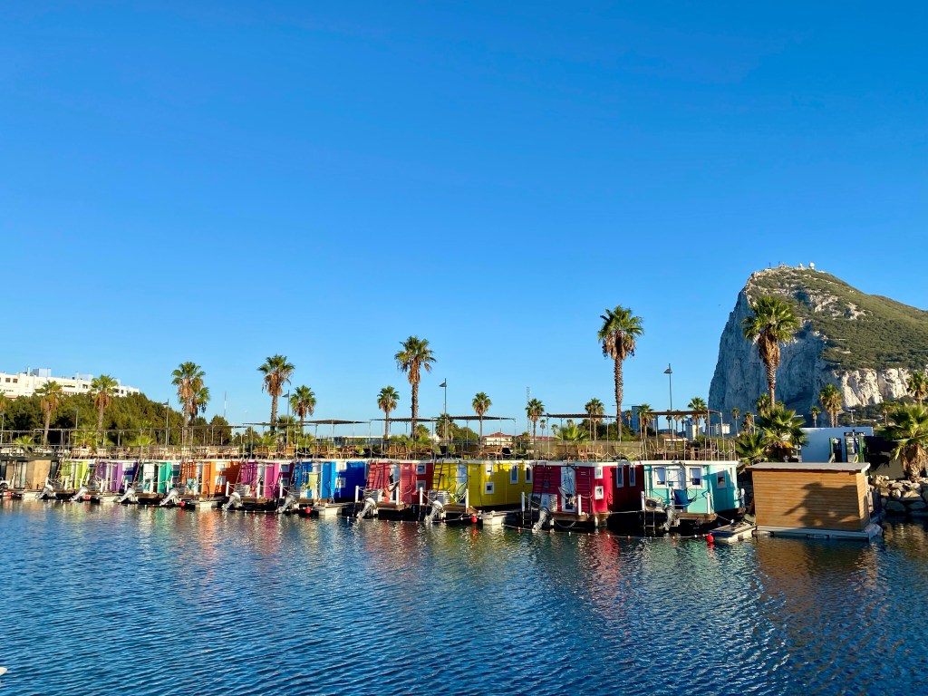 Jeg havde fundet disse charmerende kulørte husbåde “Boat Haus Mediterranean Experience” på booking.com, og glædede mig virkelig til vores første overnatningssted. Vi boede her i 3 nætter, og det aller bedste ved at bo her syntes jeg var tagterrassen, til den ene side havde man udsigt til Gibraltar klippen og til den anden side mod lystbådehavnen. Helt fantastisk.