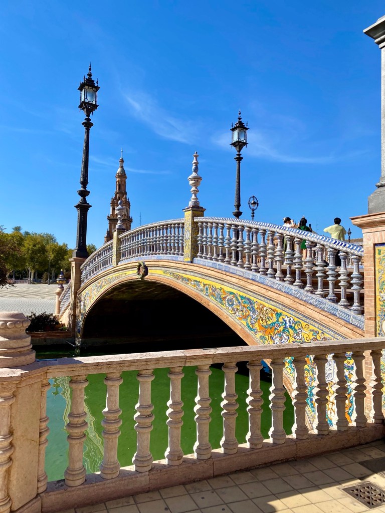 Den spanske plads skulle vi selvfølgelig også forbi, det er en kæmpe plads, 200 meter i diameter faktisk og med et brusende springvand på midten. Der er en kanal inde på pladsen, med fire broer der krydser den. Udsmykningen er farverig med kakler og fliser og her er smukke søjlegange. Der er 52 dekorerede fliser der viser alle 52 spanske provinser, de dekorerede fliser er meget typiske for Andalusien, og vi så mange spanske turister posere foran lige netop deres provins.