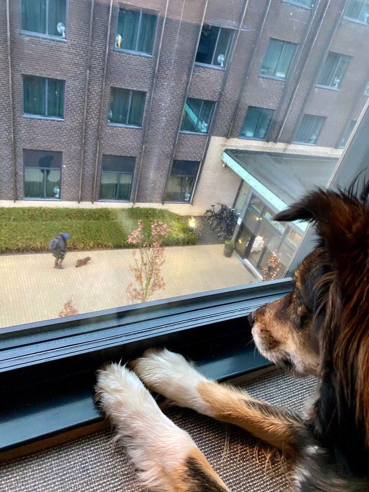 Det fungerede for mig at se fint med så mange hunde på hotellet. De fleste hunde virkede venlige, dem der sad med deres hunde i lounge området, var i hvert fald. De fleste ejerne virkede også fornuftige. En enkelt lidt irriterende oplevelse var en dame der meget af eftermiddagen og aftenen stod foran indgangspartiet med sin lille hund i dens meget lange flexline. Det var her rygerne holdt til, hvilket jo sådan set ikke var et problem, men fra vores vindue kunne vi se at der var mange der havde problemer med at komme forbi dem, da hunden i dens lange line kunne nå hele indgangsområdet. Da vi havde været ude for at lufte, og skulle ind igen, stod hun der også. Så, ja, vi ville ikke i nærheden af hendes hund. Vi tager ikke chancer og hilser ikke på fremmede hunde i strakte flexliner. Damen blev lidt fornærmet, og troede vist at det var vores hund hun skulle være bange for, og mumlede nogle fornærmende ord efter os. Så hvis damen læser med, så lad mig sige undskyld for at vi fornærmede dig, du havde sikkert styr på din hund og den var sikkert sød.