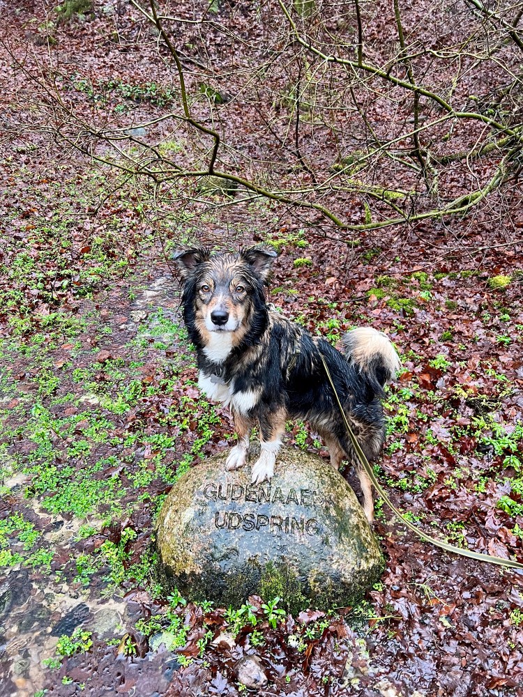 Efter morgenmaden tog vi med pakket bil mod Gudenåens Udspring. Der er rigtig mange afmærkede stier i området, og vi gik af skovstier og langs marker. Vi kom også forbi stenen der indikerer hvor Gudenåen udspringer, hvor vi selvfølgelig tog billeder af Milla. Det regnede næsten uafbrudt på vores tur, og stierne var meget smattede. Området virkede lækkert nok, så vi kommer nok forbi en anden gang, når vejret er lidt bedre.