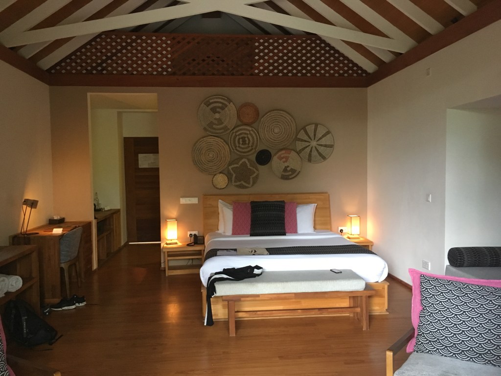 Vi boede i 5 hytter som alle lå lige ned til den smukkeste strand og min fars hytte havde egen pool også, hvilket var ret fint, for så havde vi et privat sted at samles. Hytterne er stilfuldt og enkelt indrettede, med lækkert udendørs badeværelse hvor der både var bruser og spa-bad. Dog var det ikke meget vand der kom ud af den udendørs bruser, men der var også en bruser under tag som virkede fint. Der er aircondition på værelserne, 2 solsenge på verandaen foran huset og 2 kurve solsenge tættere på vandet. Rengøring er forbi flere gange i løbet af dagen, og man føler sig meget velkommen. De ansatte er meget hjælpsomme og imødekomne. Vores safety-box og vores spabad var i stykker, men begge dele fik vi lavet ganske hurtigt (uafhængigt af hinanden).