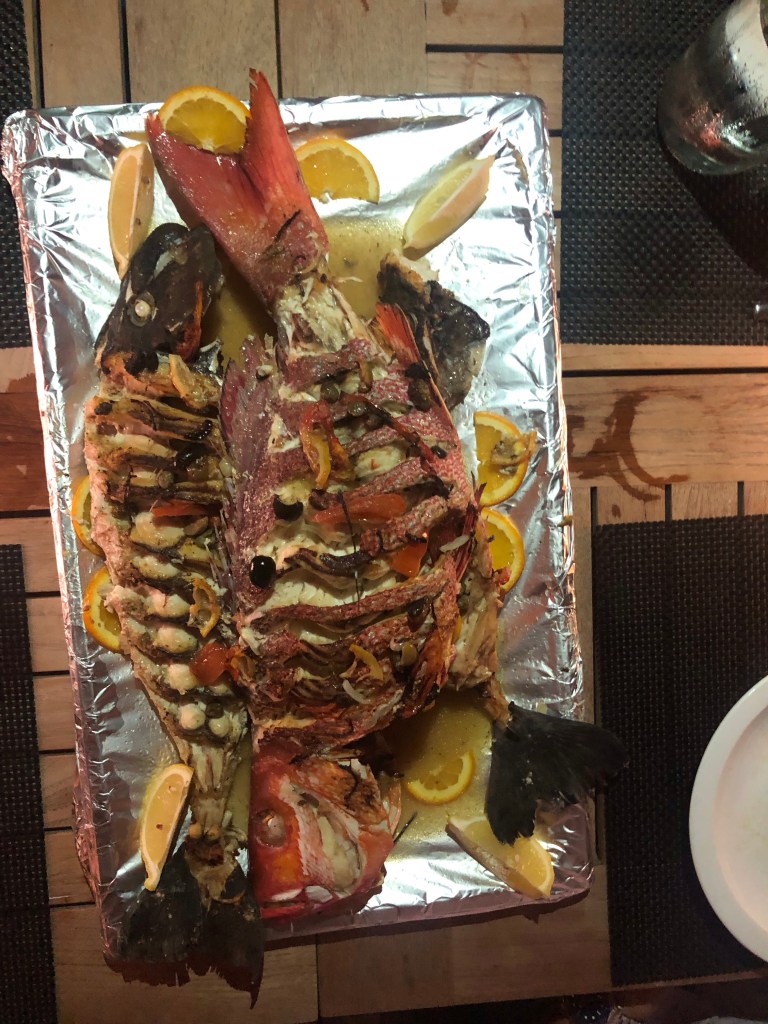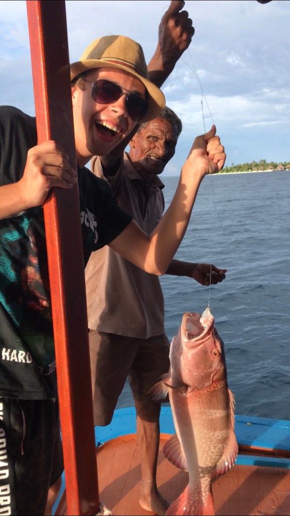 En dag tog vi på fisketur, og det er ikke som når vi tager på fisketur i Danmark. Man fisker med snor på en spole og fiskene er naturligvis, også noget mere eksotiske. Vi fik fanget nogen store flotte fisk. Det var ikke alle der fik fanget noget, men nogen fangede til gengæld flere. Da vi kom tilbage så tilberedte restauranten dem på lækker vis til os om aftenen, så vi kunne spise dem sent samme aften.