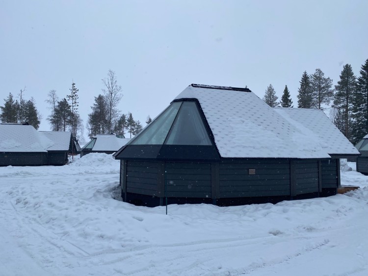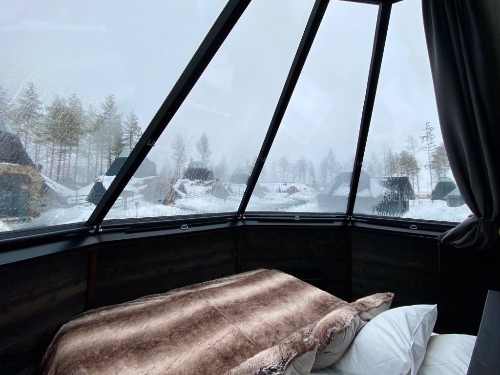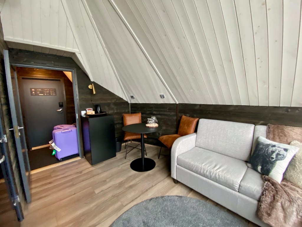 Aurora-glas-hytte : Vores hytte var som sagt en “Aurora Cabin Queen Glass Iglo”, men her findes mange forskellige slags hytter, fælles for næsten alle er at de er bygget så man kan ligge i sin seng og kigge på nordlyset, hvis man altså er så heldig at nordlyset indfinder sig. Så heldige var vi ikke, faktisk var det overskyet og sneede en del da vi var der, så det eneste vi kunne se var sne. Der er dog indbygget varme i glastaget, så man kunne godt se ud alligevel. Vores hytte havde en lille entre med en lille bænk og knager til jakker. I selve hytten var der et lille bord med to stole, en sofa, et skab og en lækker dobbeltseng placeret under glastaget. Ved siden af sengen var der også en lille elpejs med flammeeffekt. Det hele var meget smagfuldt og hyggeligt indrettet, og hytten føltes dejlig varm. Der var også et lille køleskab samt elkeddel på værelset, så man kunne lave the, kaffe og varm cacao. Der var selvfølgelig også et badeværelse med alt hvad der skulle være. Det eneste lidt uprofessionelle ved hytten var at gulvet var ret skævt, og vi havde lidt problemer med det ene rullegardin, men det må siges at være småting.