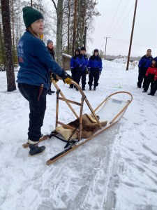 Da vi blev hentet ved resortet var vi 30 personer, som efter en grundig instruktion, blev delt i grupper af 10 personer. I vores gruppe var der en familie med mindre børn som havde en længere slæde, så de kunne være 4 sammen, 1 voksen og 2 siddende børn samt en stående voksen. Vi andre kørte 2 og 2. Så 4 slæder i alt. Der var 2 guider der fulgte os på snescootere, en forrest til at guide hundene og 1 bagerst. Det ærgerlige ved dette var lugten fra snescooterne, men ellers en rigtig fin tur på ca. 7-10 km af små snoede skovstier. Halvvejs på ruten tog en af guiderne et par billeder af os og vi kunne bytte fører.