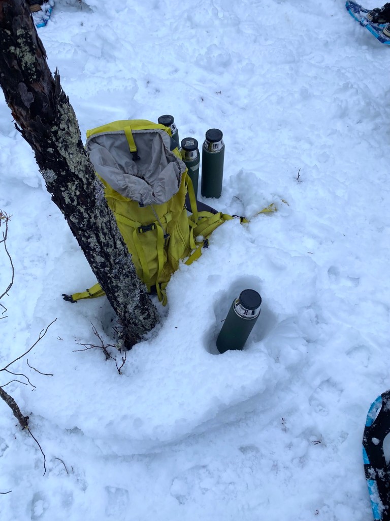 Skoven vi gik i så, med sine små træer, meget ung ud, men det var den ikke. Her voksede træerne bare meget langsomt, så et lille træ kunne let være 20 år og et større kunne let være 100 år gammelt. Halvvejs på turen drak vi en kop varm saft og spiste et par småkager. Den ene af hjælperne fortalte om hendes guksi (det samiske navn) / kuksa (det finske navn), som er den traditionelle kop, som vi fik serveret de varme drikke i, når vi var på ture. Dem på turene var af plastik og kunne gå i opvaskemaskinen, men de rigtige er håndlavede og af træ, træ som er selvrensende og antibiotisk, så de måtte slet ikke vaskes op. Hun fortalte at hendes svoger fremstillede dem, så hun havde stor viden om dem, og fortalte meget passioneret omkring dem. Om hvordan man ikke skulle købe dem, de skulle i stedet gives i gave, og om hvordan de skulle indvies og meget mere. Af alle de guider og hjælpere vi mødte heroppe, var det tydeligt, at dem med kniv og guksi i deres smukke bælter, var dem som havde den samiske kultur helt inde under huden, og dem var hende her absolut en af.