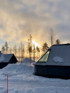 Placering: Resortet ligger 18 km nordøst fra Rovaniemi centrum og 10 km fra Rovaniemi Lufthavn. Afhentning og aflevering i lufthavnen var inkluderet i vores ophold, så det var nemt og bekvemt, og tog ca. 10 minutter i Taxa. Resortet har en overskuelig størrelse, og hytterne ligger tæt, men uden at man føler sig generet. På området er et par heste, lidt rensdyr, et par bålhytter og et kælke område. Her er også 3 saunaer der ligger lige ud til en stor sø, samt en sauna med tilknyttet udendørs spabad.