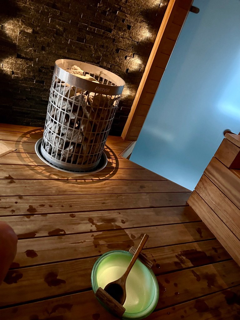 Bagefter var vi en privat tur i sauna og udendørs jacuzzi. Vi havde booket at have det fra kl. 13.30-15.00. Området bestod af omklædningsrum, toilet, bad med 2 brusere, elektrisk sauna og en stort udendørs spa. Her var håndklæder, tøfler og en flaske vand til os hver. Det var lige i overkanten varmt for mig, men det var total hyggeligt at det småsneede men vi var der, så kunne man blive kølet lidt af de små bitte snefnug der dalede ned, mens man sad i det varme vand. Både sneen, den kolde luft og vores halve liter vand var mit anker. Men til trods for at jeg var ved at gå til af varme, var det faktisk ret hyggeligt.