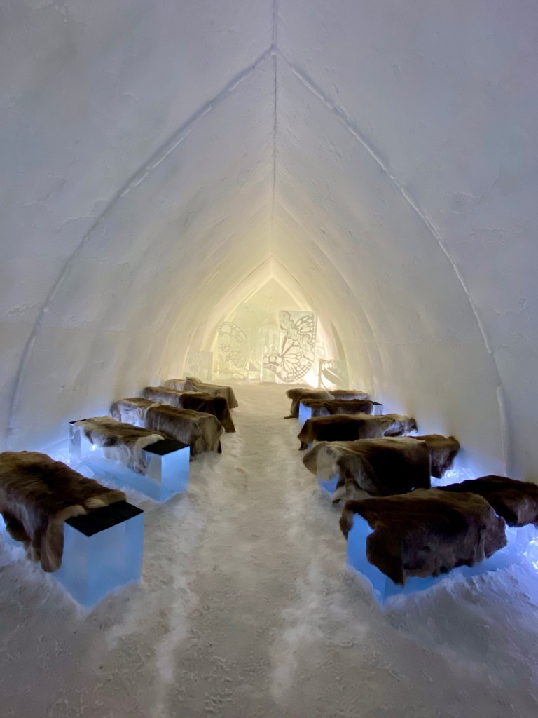 Det er også muligt at blive gift på ishotellet, her var et flot kapel, hvor gæsterne ville kunne sidde på isbænke beklædt med rensdyrskind. Jeg tænker dog at det nok går ret hurtigt, sådan et isbryllup.