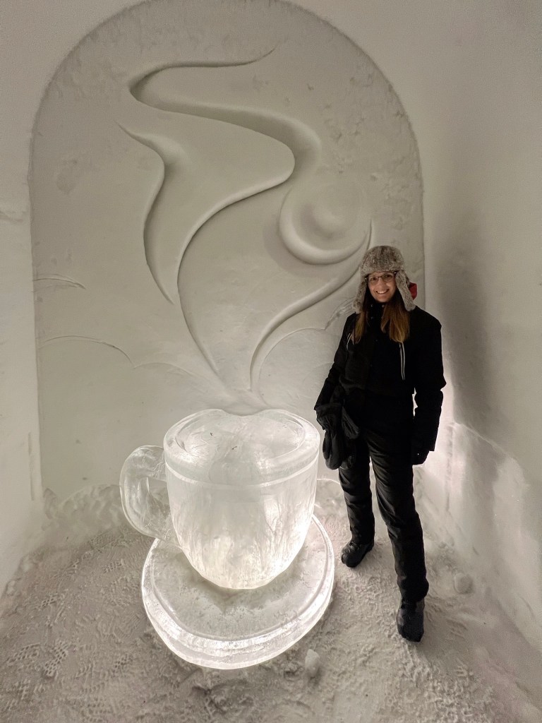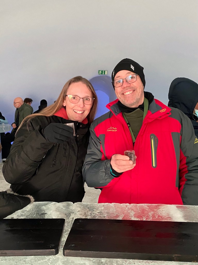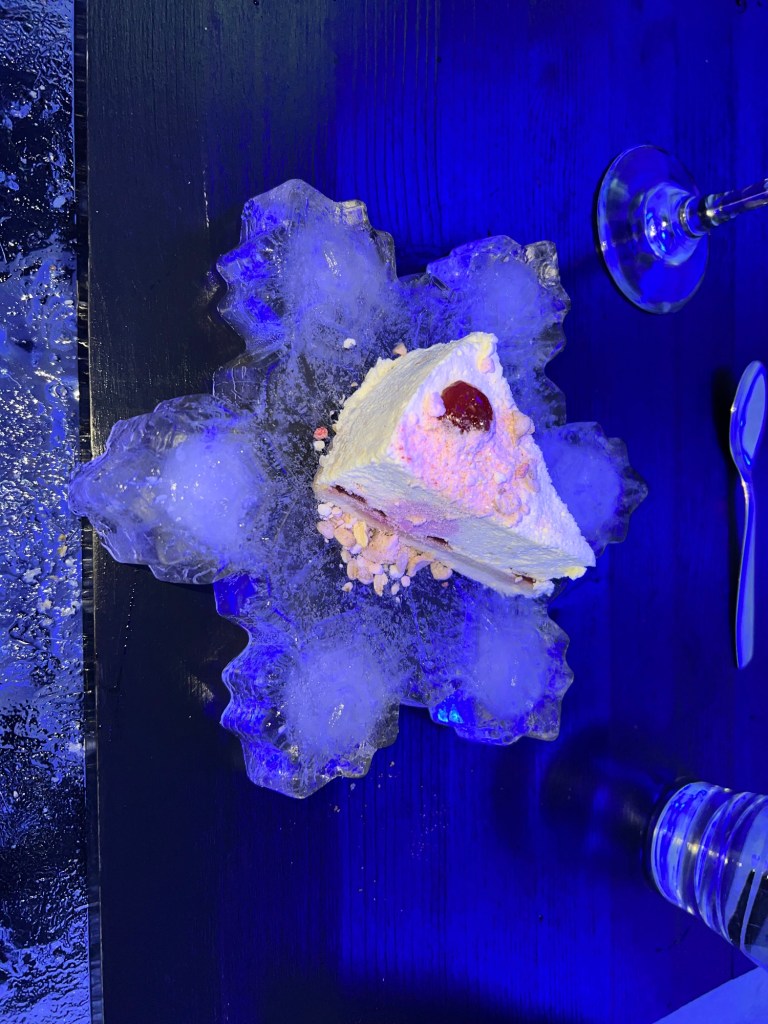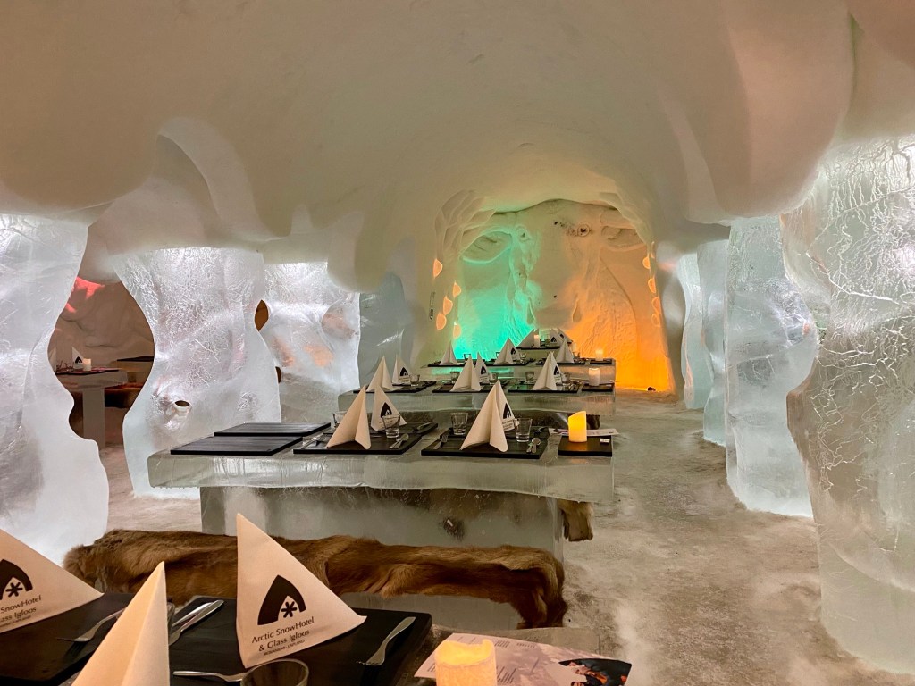 I isrestauranten spiser man ved borde som er lavet af is, på bordrene er der skruet nogle plader fast, som mad og drikkevarer sættes på. Bænkene er også af lavet af is, godt beklædt med rensdyrskind, og selv desserttallerknen var lavet af is. Vi havde selvfølgelig godt med tøj på, så vi kunne absolut nyde denne enestående oplevelse.