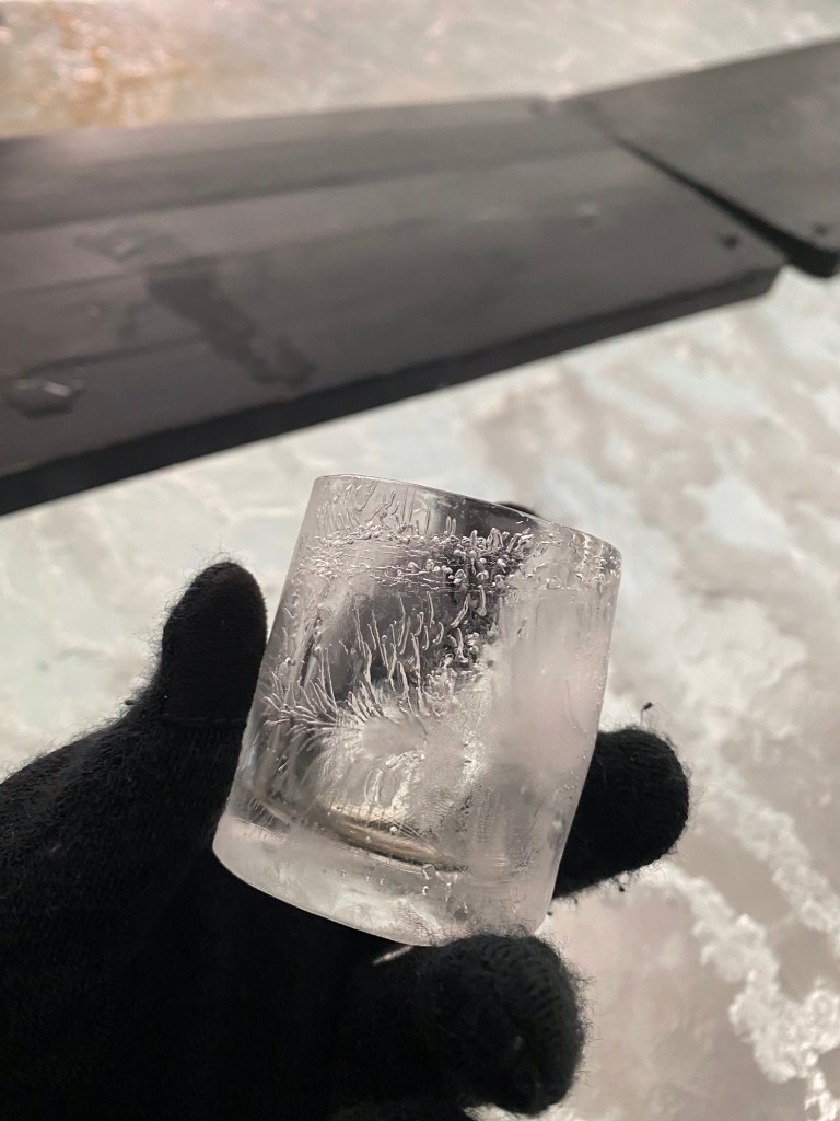 Efter at have beundret alle værelserne, gik vi i isbaren. Her er selve baren, samt bænke og borde lavet af is. Vi skulle selvfølgelig her have den klassiske drink i isbaren, som blev serveret i et shotglas lavet af is. Vi valgte bartenderens yndlings finske vodka, vi var jo trods alt i Finland, og vi havde ingen steder fået serveret vodka indtil da. Nu er jeg ikke så meget til vodka, men jeg må give ham, at den faktisk var ganske okay. Efter at vi havde tømt glassene, skulle de, traditionen tro, kastes mod væggen.