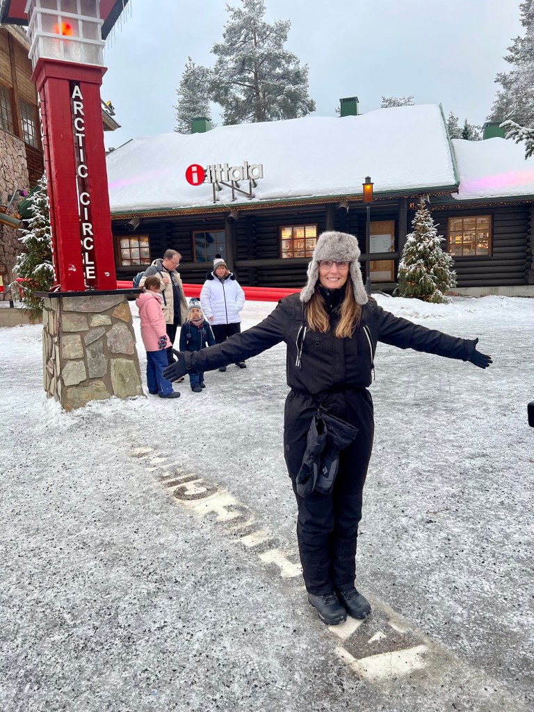 Lidt hen af eftermiddagen tog vi så Apukkas shuttlebus til Santa Claus Village. Turen med bussen tog små 10 min, og vi brugte så 1 time på at gå rundt og kigge på de oplyste julegader. Vi fik selvfølgelig også stået på polar cirklen, som er markeret på torvet. Derudover gik vi på julemandens posthus som er pyntet op og hvor man kan se julemanden, men da vi nåede køen til julemanden, sprang vi fra.