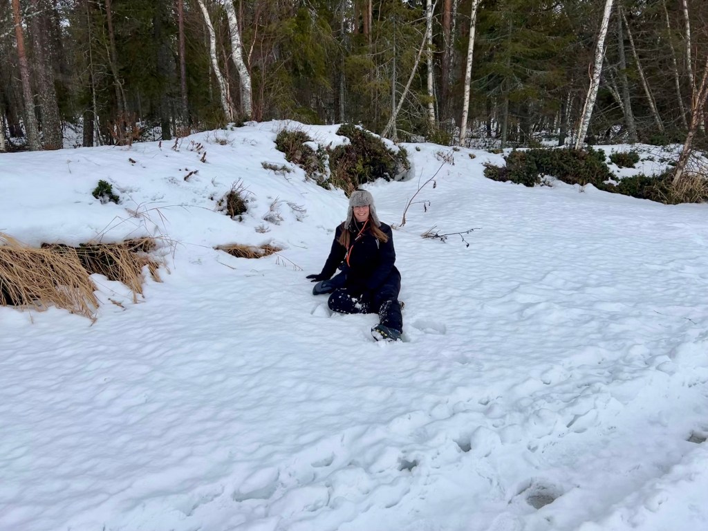 Temperaturen var kun omkring frysepunktet, så det var tung sne vi gik i, og vi fik dermed også rigtig testet hvilken forskel det gjorde, at have sneskoene på. Det var generelt en speciel oplevelse at gå med dem på, jeg havde ikke prøvet det før, men når man bare havde lidt afstand mellem fødderne når man gik, så var det faktisk let. Det med at vende på en tallerknen var derimod svært, så der måtte jeg lige en tur i sneen. Jeg var heller ikke den eneste der var nede, så mange af de andre deltagere havde de samme udfordringer som mig.