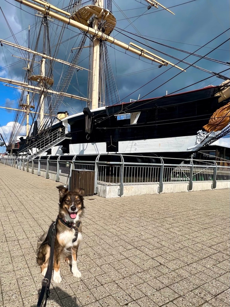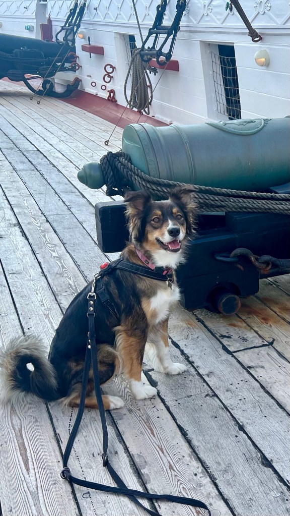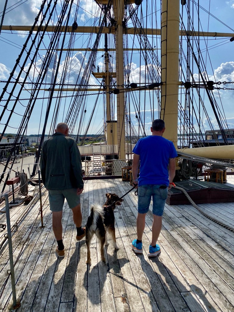 Fredag efter rundvisningen brugte vi lidt tid i parken og fik også lidt frokost. Herefter besluttede vi at køre en tur ind til Ebeltoft for at se Fregatten Jylland. Her var Milla selvfølgelig med, og hunde er også velkomne ombord.