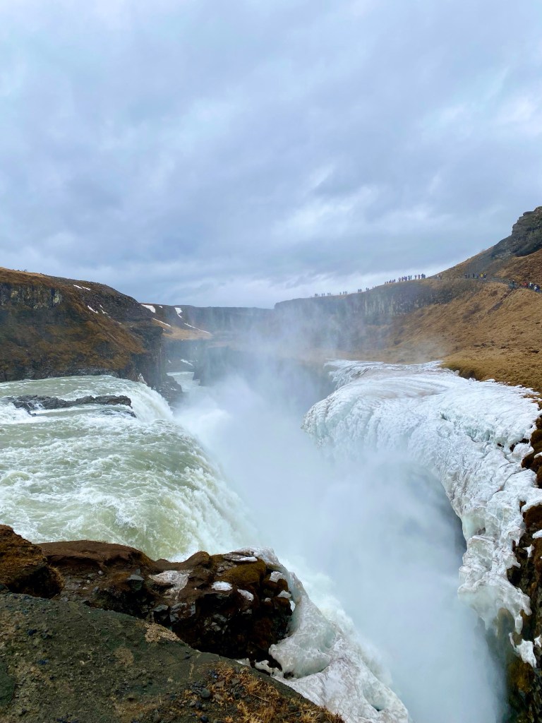 Gullfoss vandfaldet, det gyldne vandfald, var tredje stop på vores Golden Cirkle tur. Det er et af de største turistattraktioner på Island, i gennemsnit bliver det besøgt af mere end 2000 personer om dagen.
