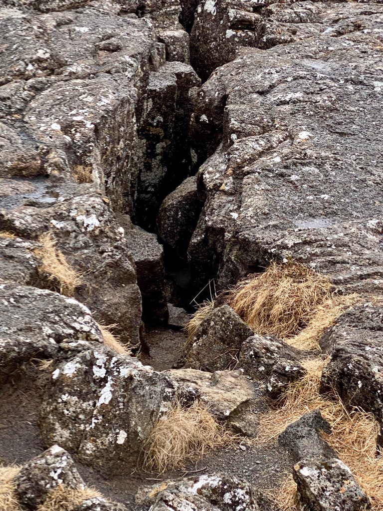 Sidste stop på turen var Thingvellir (Þingvellir), som er på Unescos verdensarvsliste. Normalt vil de tektoniske plader mødes under havoverfladen men her kan man se den nordamerikanske og eurasiske tektoniske plade mødes på jordens overflade. Linjen skulle rykke sig hele 2 cm fra hinanden om året, så om nogle få millioner år vil Island være delt i to dele. Man kan tydeligt se sprækkerne som dannes når de tektoniske plader arbejder sig væk fra hinanden. Vi gik i kløften, hvilket er en flot tur, men det er også muligt at dykke og snorkle mellem de tektoniske plader.