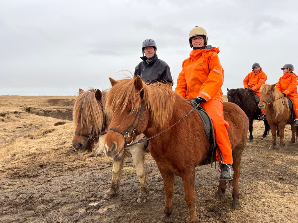 Man låner orange regnbukser og regnjakke af dem som er tykt regntøj, det er fuldstændig vandtæt, som man kan tage ud over sit eget tøj. Det meste af det regntøj man normale har ikke er vandtæt ved vedvarende regn, og de får meget regn på Island, så det vil være ærgerligt at få ødelagt oplevelsen, fordi man ikke er klædt ordentligt på. Så låner man selvfølgelig også ridehjelm og bliver efter hurtig ride-intro sat sammen med en hest. Rideturen foregår på deres store areal, på tilredne stier, i en lang række. Jeg fik lidt den samme følelse, som når man i Thailand bliver trukket rundt på en elefant på en fast sti, som elefanterne kan til bevidstløshed. Her ridder man dog selv, men følelsen var for mig nogenlunde den samme. Man går dog stadig i den smukke islandske natur, så det var ikke fordi jeg ikke nød det, det er bare meget rutine præget. Undervejs gjorde vi et enkelt stop hvor de 2 guider var rundt og tage billeder af os. De trak lidt rundt på hestene, så billederne blev taget af dem man var sammen med, men jeg kunne godt have ønsket mig at man var blevet fotograferet så man ikke fik de andre turister med på billederne også. På det punkt er servicen faktisk bedre i Thailand, selvom man giver et par Baht til fotografen.