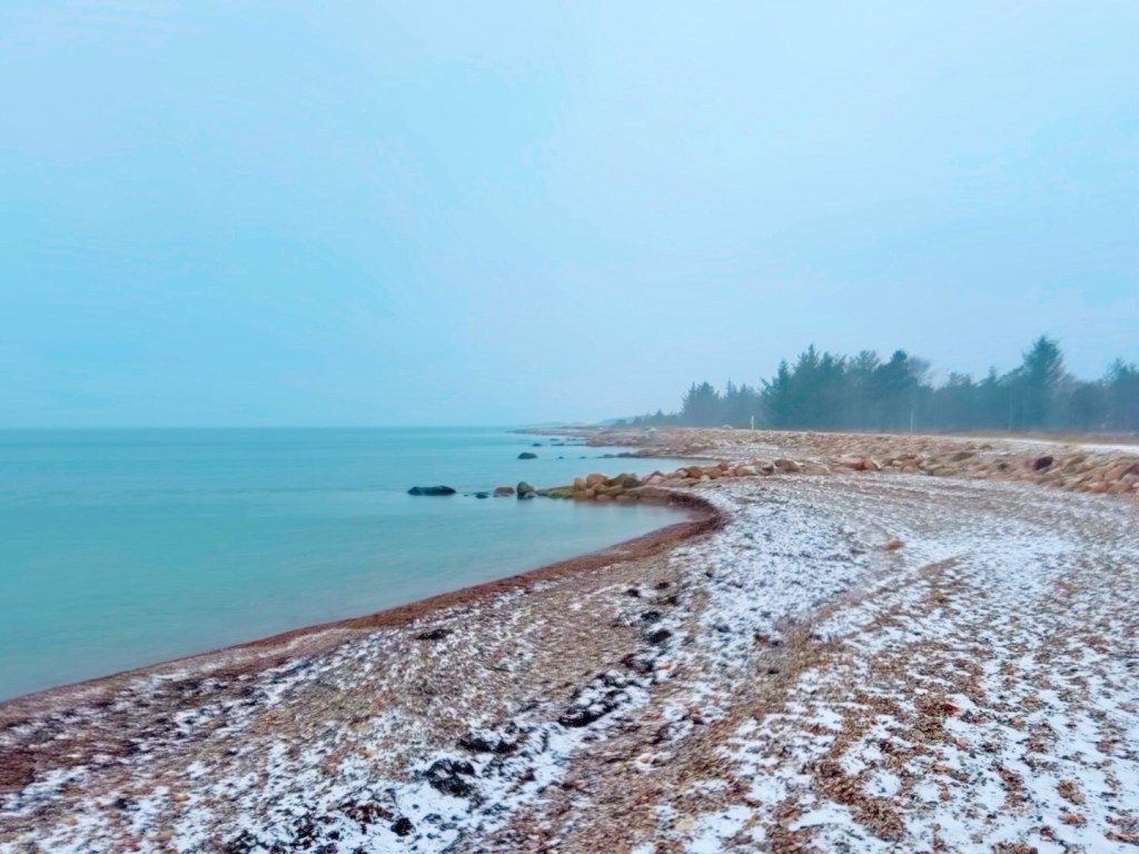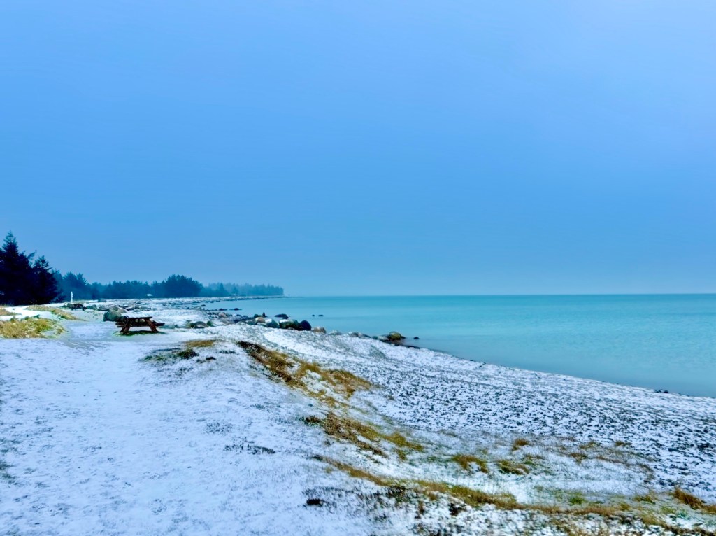 Der var faldet lidt sne, og da vi nåede sommerhusområdet langs fjorden, begyndte sneen lige så stille at dale igen. Vi hold frokost- og kaffepause ved et af de opstillede bord-bænkesæt ved fjorden. De forbipasserende sendte os lidt undrende blikke, de fleste af dem lignede også nogen der frøs, men vi nød den varme mad og kaffen i det kolde, stille snevejr. Måske tænkte de, at vi var en smule tossede, men jeg synes det var helt perfekt.