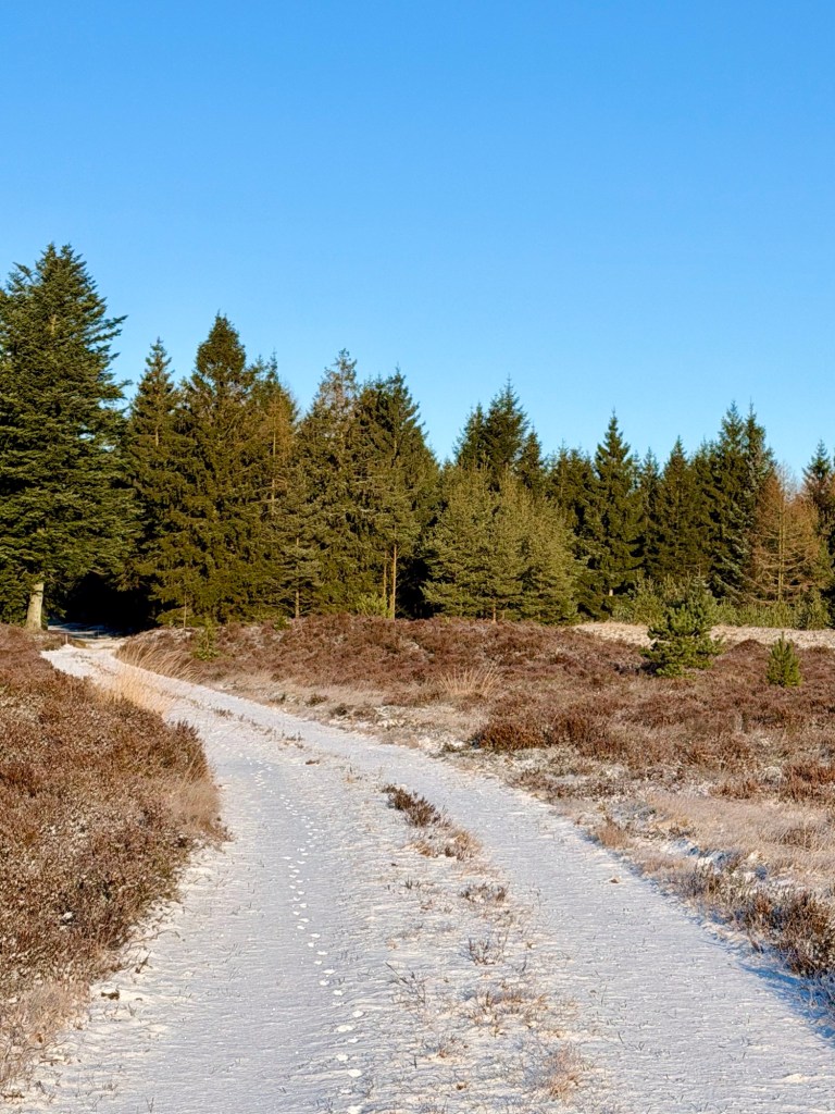 Landskabet gik ad stier gennem hovedsagelig nåleskov og over den jævne og øde hede. Området virkede populært, og på parkeringspladsen ved Naturcenteret så vi da også en del andre, men da området er stort, mærkede vi ikke meget til andre på ruten. Det var et smukt område og der lå stadig et fint hvidt lag sne på stierne. Det blev en tur på lige under 5 km, på under halvanden time. Sikke et dejligt afbræk på vejen hjem.