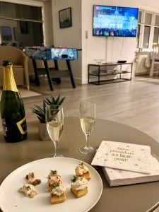 Når vi er i sommerhus til nytår, plejer vi at købe en af de færdige nytårsmenuer, der tilbydes. Det er både lækkert og utrolig nemt. Desuden indebærer det ikke at man skal bruge en masse basis varer, som man aldrig har, når man er i et sommerhus. Så efter kongens nytårstale kunne vi tage den føromtalte tur i vildmarksbadet, spise en spændende nytårsmenu og til sidst se 90-års fødselsdag inden rådhusklokkerne ringede. Den velkendte klang, der altid markerer starten på opkald og beskeder til familie og venner.