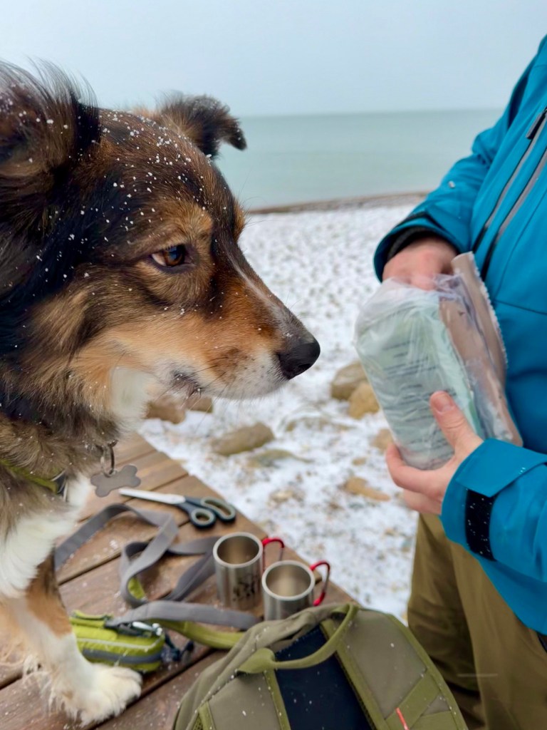 Frokost og kaffe var naturligvis med i rygsækken, så undervejs fandt vi et skønt sted med læ i klitterne. Det var vinter, men med godt med tøj på, læ for vinden og varm mad smagte frokosten ekstra godt. I alt brugte vi omkring 2 timer og 45 minutter på turen, inklusiv frokostpause. Vi tog derfra både vindblæste, mætte og fyldt med indtryk.