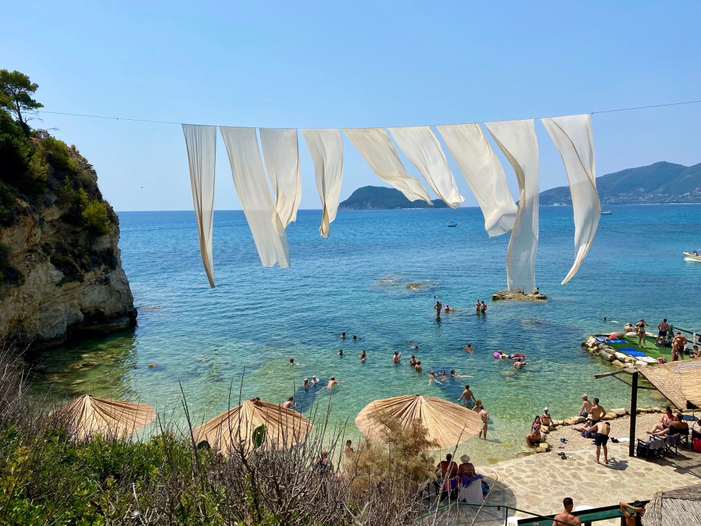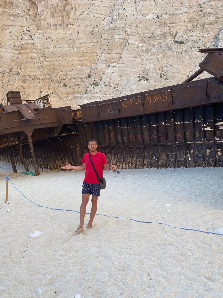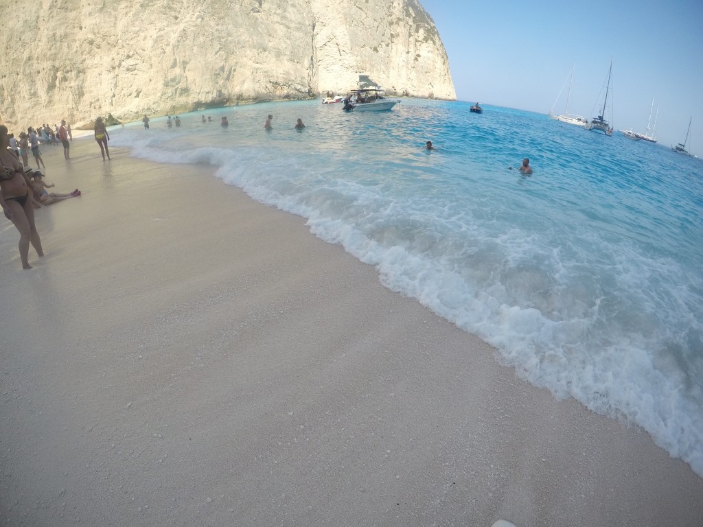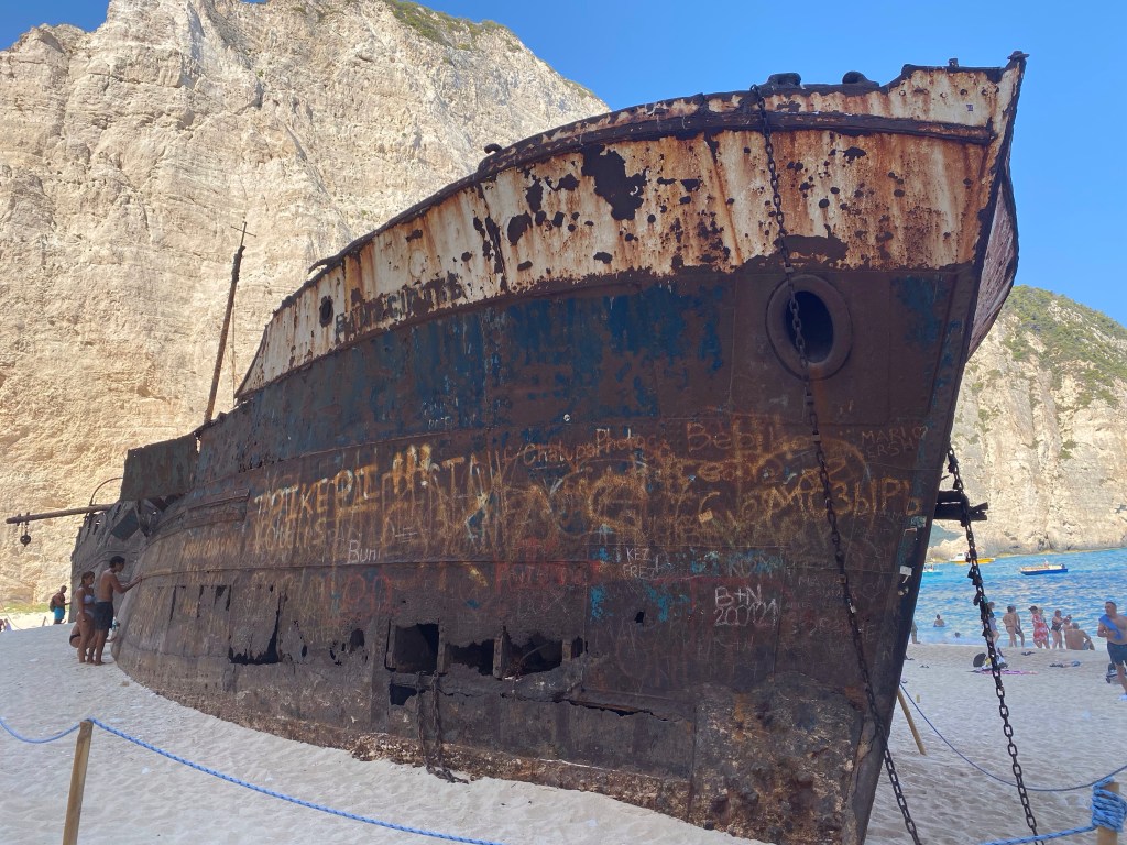 På Shipwreck Bay gik vi i land og guiden fortalte historien og det forliste skib, som han fik fortalt på spændende og humoristisk vis. Det er en god historie, og uden historien er det bare et skibsvrag. Stranden som man kun kan sejle til, da den ligger mellem klipper, er lille og meget betagende med det klare blå vand, de smukke klipper og de lyse småsten, indbyder den til en dukkert. Som en af de største seværdigheder på Zakynthos er der selvfølgelig også fyldt med turister, så det må man tage med.