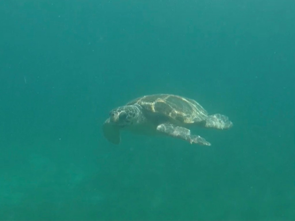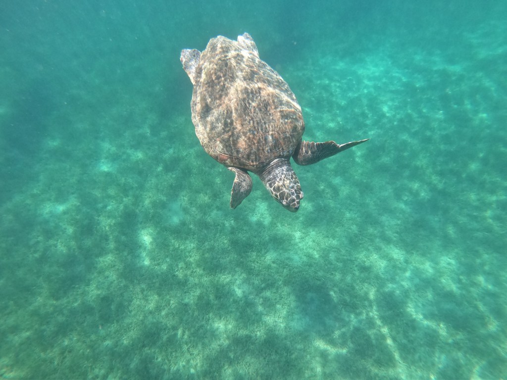 Da vi var næsten tilbage ved udgangspunket tog guiden os med hen hvor han i et par dage havde set en skildpadde, som var på det samme sted, på samme tid, hver dag, og i dag var den der også. Det var en skøn oplevelse da vi så den svømme tæt ved vores kajakker og da den stak hovedet op ad vandet tæt ved os.