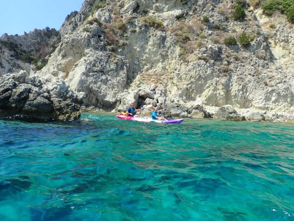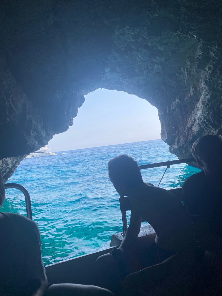Et sted gjorde vi holdt undervejs hvor vi kunne svømme, her var der mulighed for at springe ud fra klippen, og det synes drengene var rigtig sjovt. Det bedste for mig var da vi gjorde holdt ved en klippehule med en lav indgang hvor vi kunne svømme dybt ind med guiden. Det var utrolig smukt, hulen var lang, smal og høj. Da vi bagerst i hulen vender os om er vandet helt eventyrligt funklende, turkist og magisk smukt, en virkelig god oplevelse.