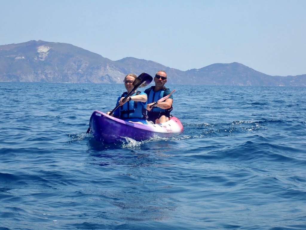 Vi havde booket en tur hvor vi skulle padle i kajakker rundt om øen Marathonisi også kaldet Turtle Island. Den lille karakteristiske ø, som næsten ligner en skildpadde, ses fra Kalamaki Beach hvor vi boede og den er et beskyttet yngleområde for havskildpadden Loggerhead med det skønne videnskabelige navn “Caretta Caretta”. Det er verdens største havskildpadde med hårdt skjold, den har en levetid på 47-67 år og kan veje fra 80-200 kg. Jeg håbede virkelig at vi fik mulighed for at se en af disse havskildpadder.